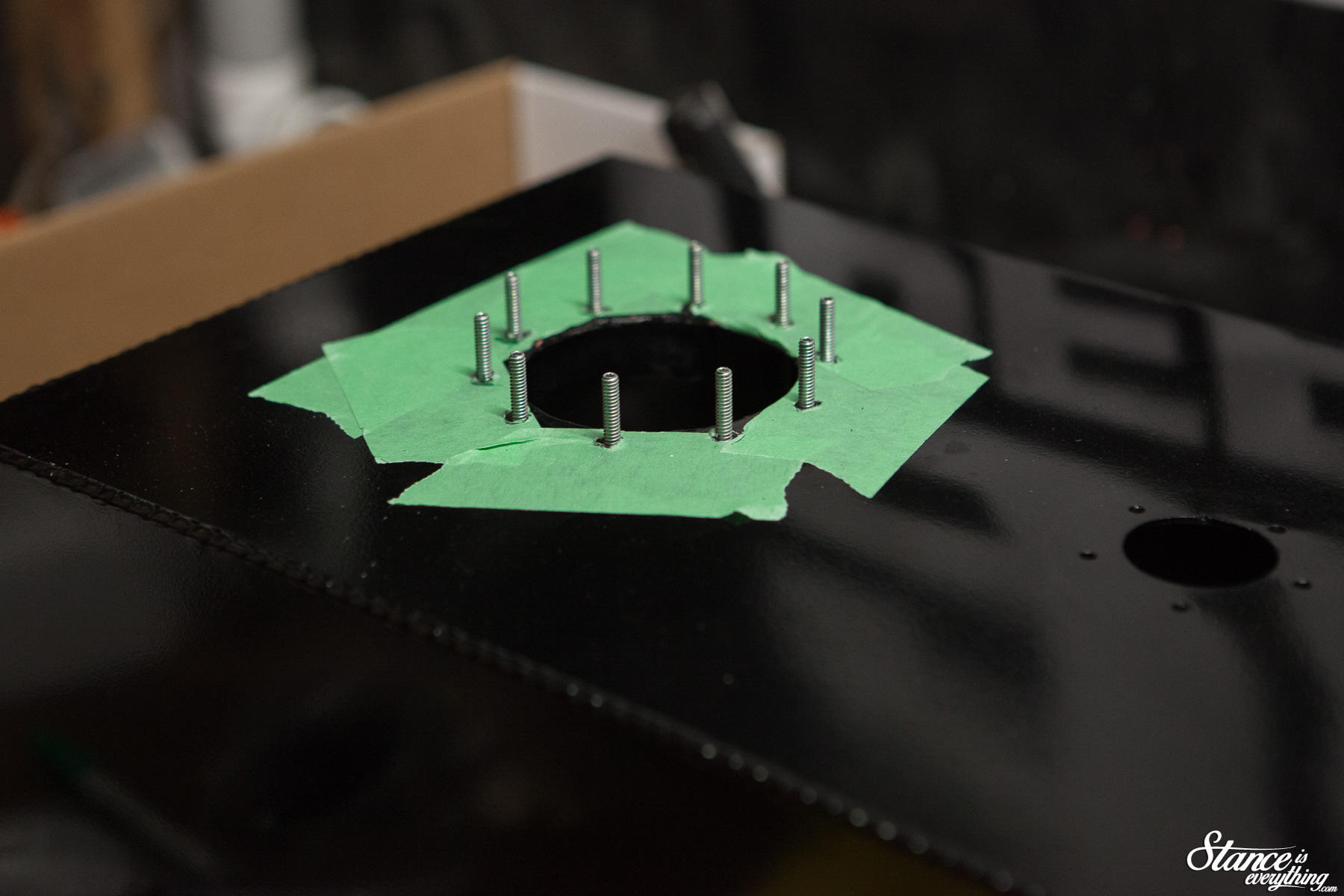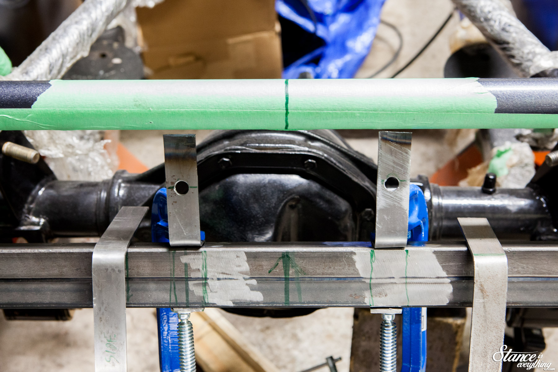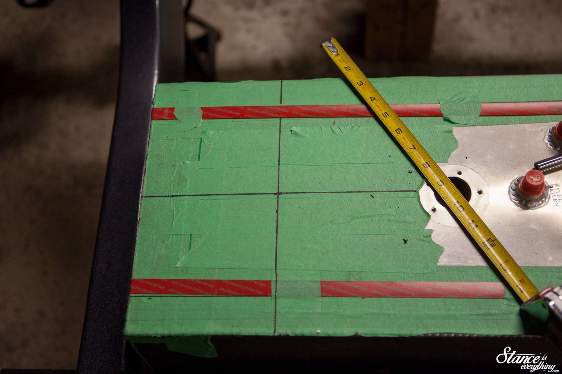 Using green tape –tape which I should buy by the crate at this point– and a sharpie to mark the center lines on the chassis I started with the compressor mounts and lower tank mount.