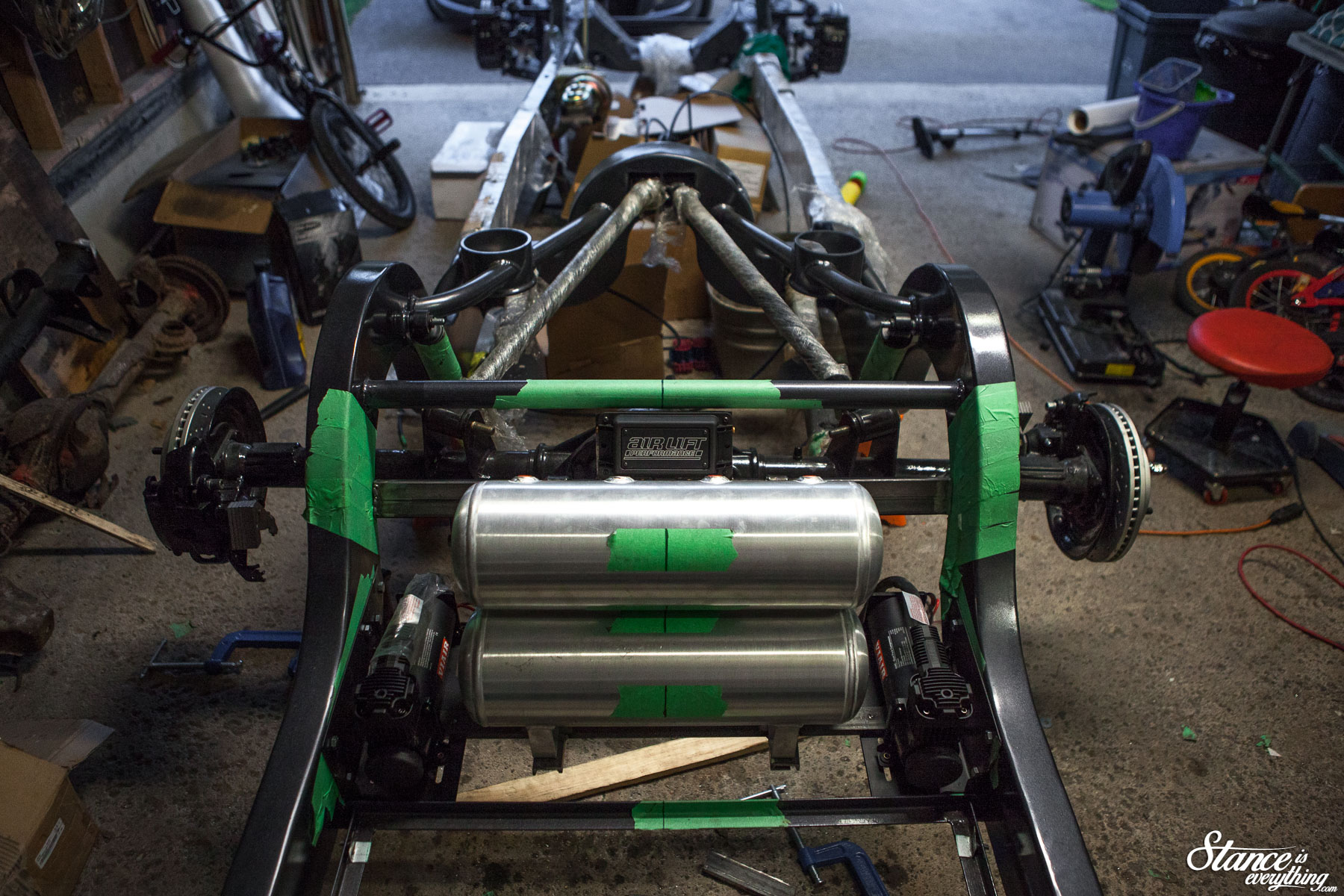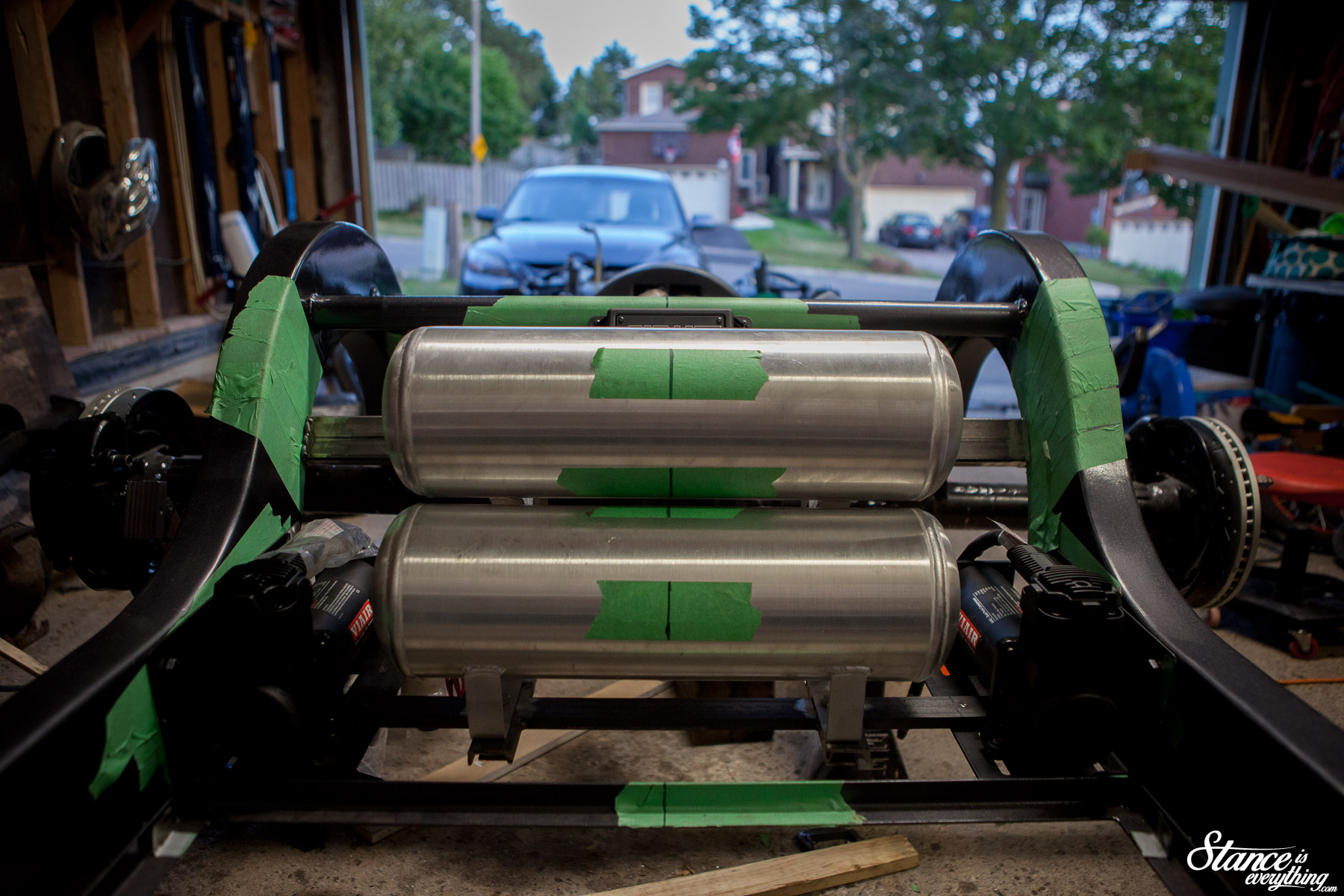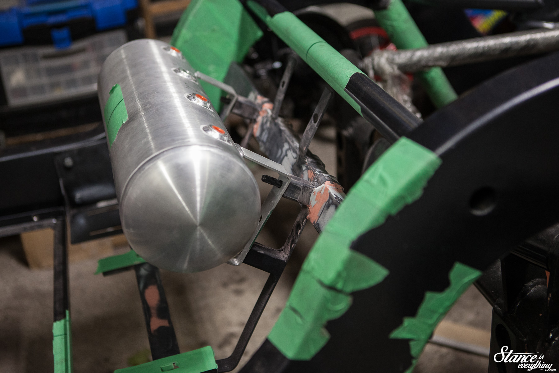 After holding the tanks and compressors in various positions all about the chassis, I settled on a pocket of space between the axle and the fuel cell.