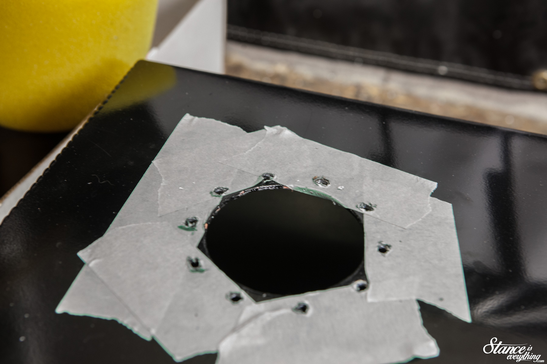 To begin the installation I selected a spot on the tank that looked symmetrical with everything I had already positioned. Then cordless drill made short work of cutting the hole and popping in the mounting holes.