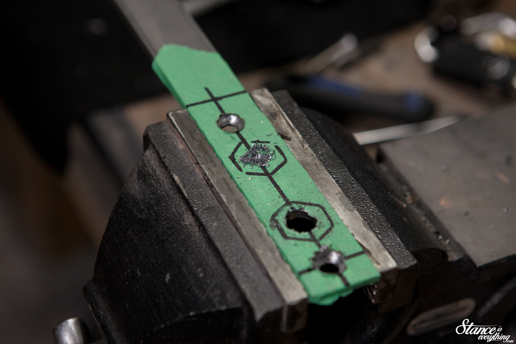 New mounting holes were drilled next, and the frame was tapped to accept bolts.