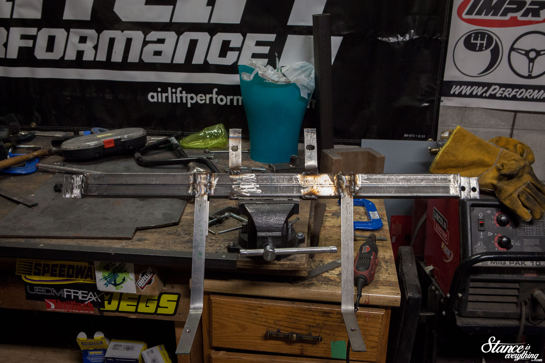 A quick solve for this was spacing the upper tank out from the cross member just enough to run the related plumbing and wiring. Above is the necessary spacing mocked up with wood and the aforementioned box steel/angle iron test piece.