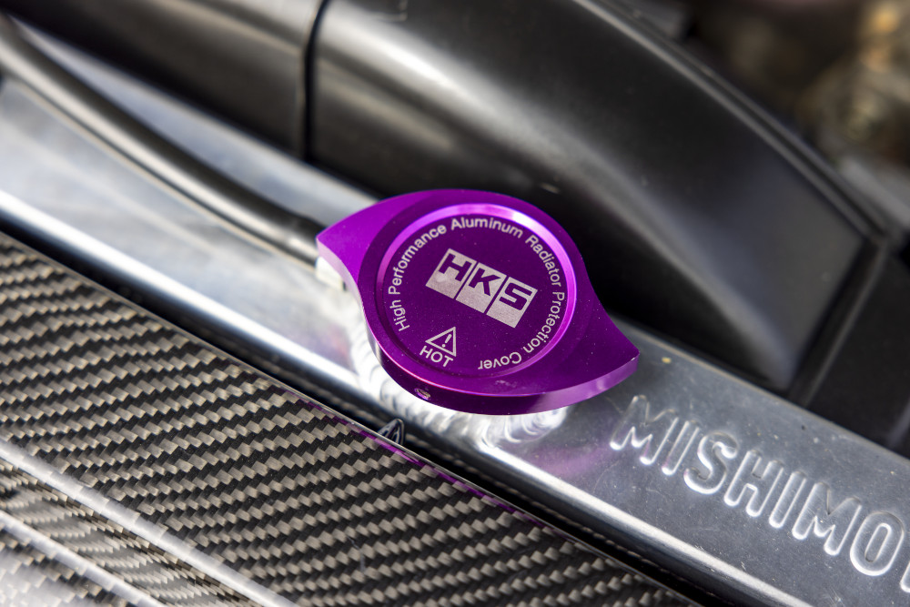 Under the bonnet, this RB26DETT is all killer, no filler. Think uprated HKS turbos, HKS race cams, HKS fuel rail/injectors, A’PEXi Power Intake, front-mount intercooler, Mishimoto radiator & oil cooler, Fujitsubo Legalis exhaust with decat, and a Link G4 ECU delivering launch control and anti-lag—mapped for a healthy 550bhp. It’s old-school turbo drama with modern reliability; tidy touches like a carbon slam panel and Ultra Racing brace keep the bay purposeful, not flashy.
