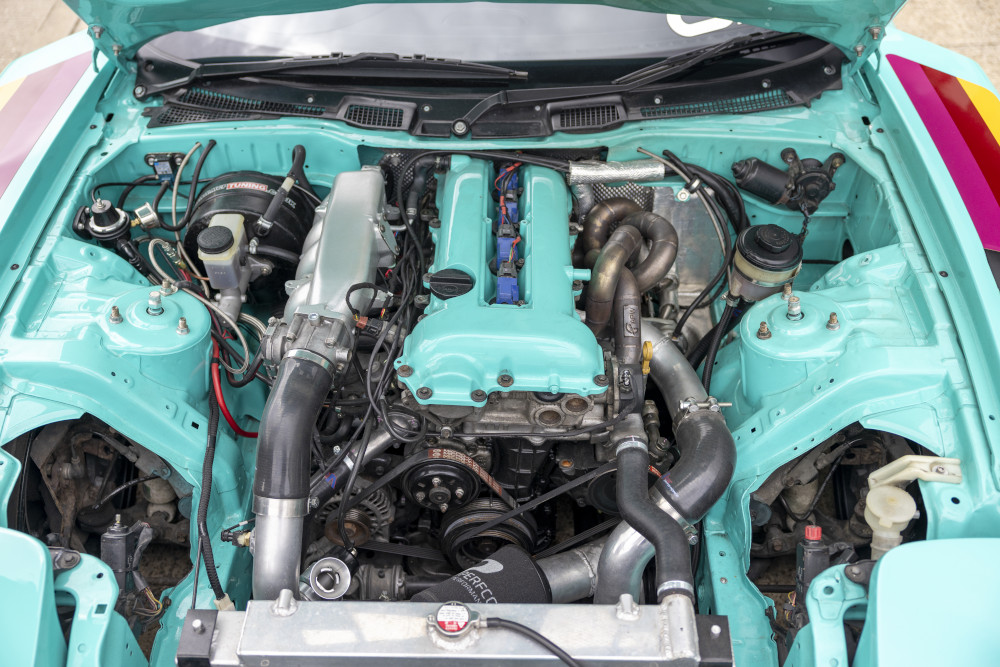 • Engine/Tuning: SR20DET swap; Pulsar Turbo (turbo + intercooler); Turbosmart BOV/FPR6/eBoost2; ECU Master management + Digital Display + PMU; ATL fuel cell; Odyssey race battery; custom dual side-exit exhaust; engine refresh + full vehicle wiring by Motor City Performance; approx 450–460bhp.