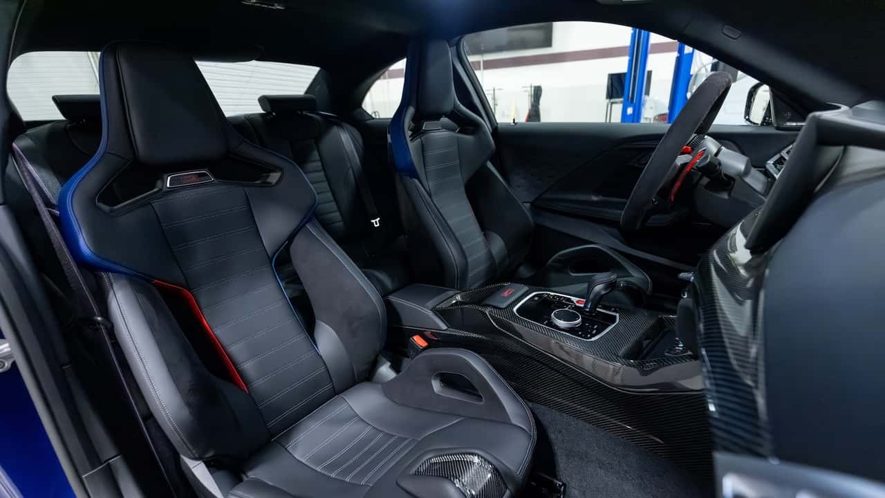 In the cabin, deep carbon fiber bucket seats keep front seat occupants well contained. They’re not comfortable for all body types, but they were somehow comfortable enough for my six-foot-three stature and 34-inch waistline. They helped maintain an excellent performance driving posture. These seats are normally a costly option on the base model.