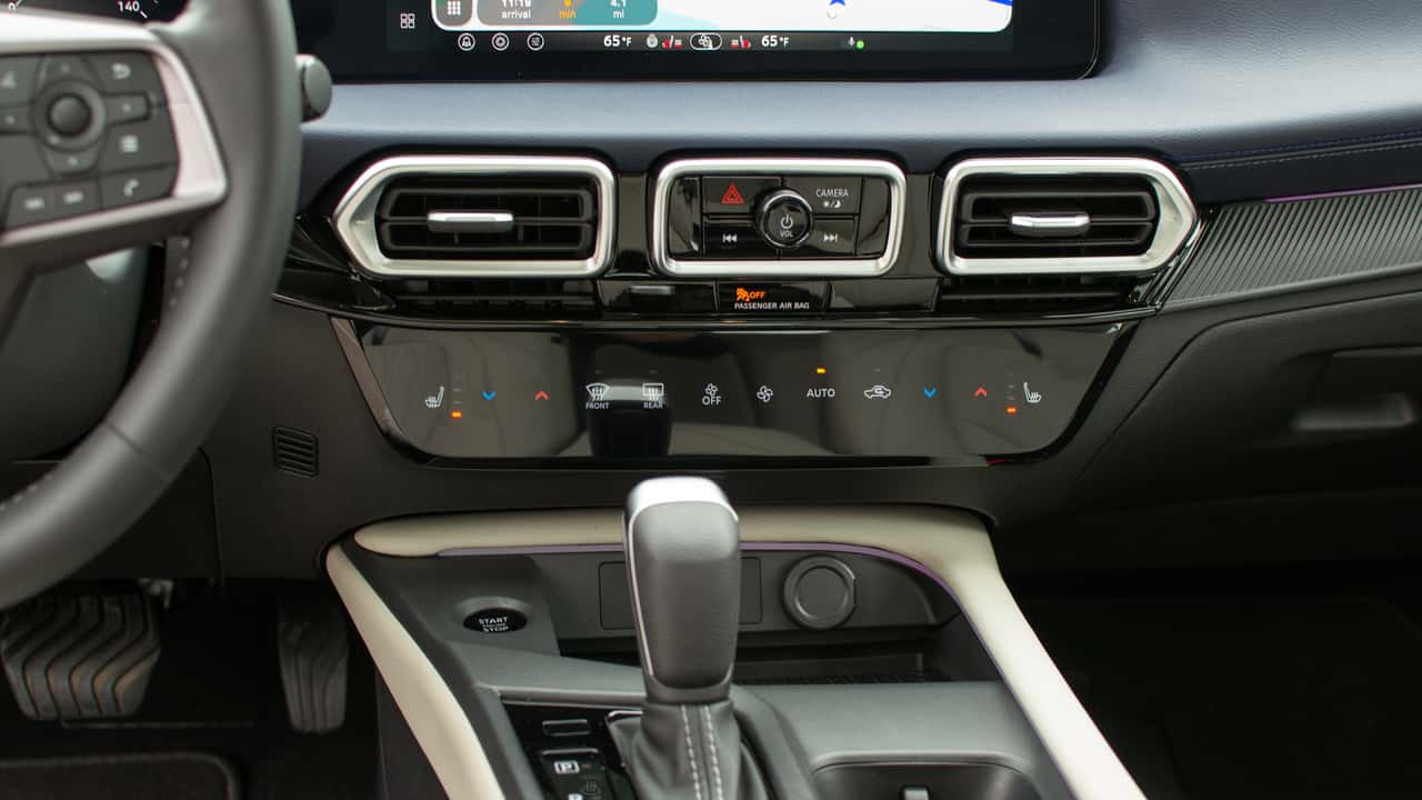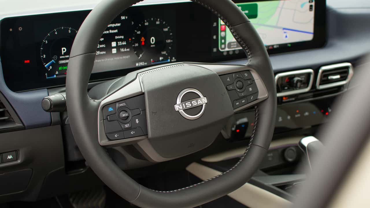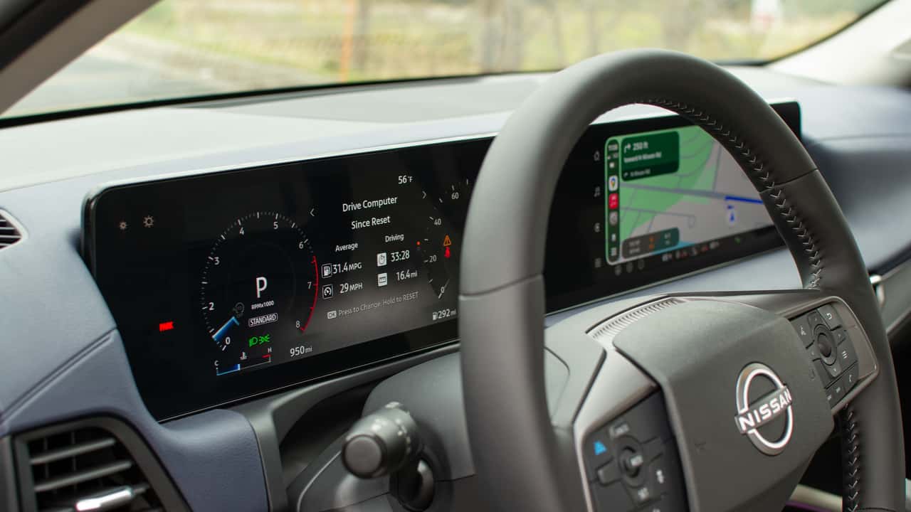There are a handful of physical buttons. The Sentra borrows the volume and hazard stack from the Leaf, which sits between the central vents. There are also controls for the drive modes, auto stop-start, and auto hold functions located behind the shifter and a few buttons on the left side of the steering wheel, such as those for the heated steering wheel.