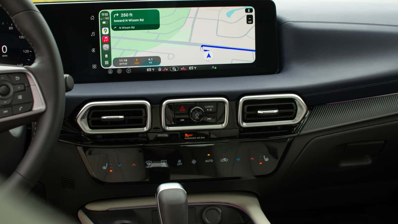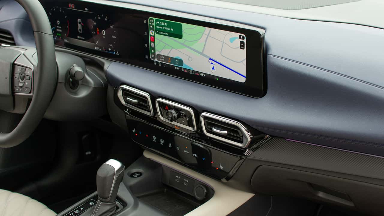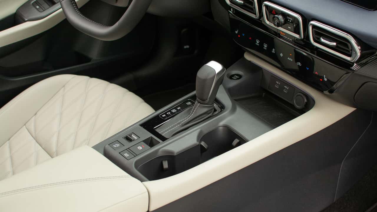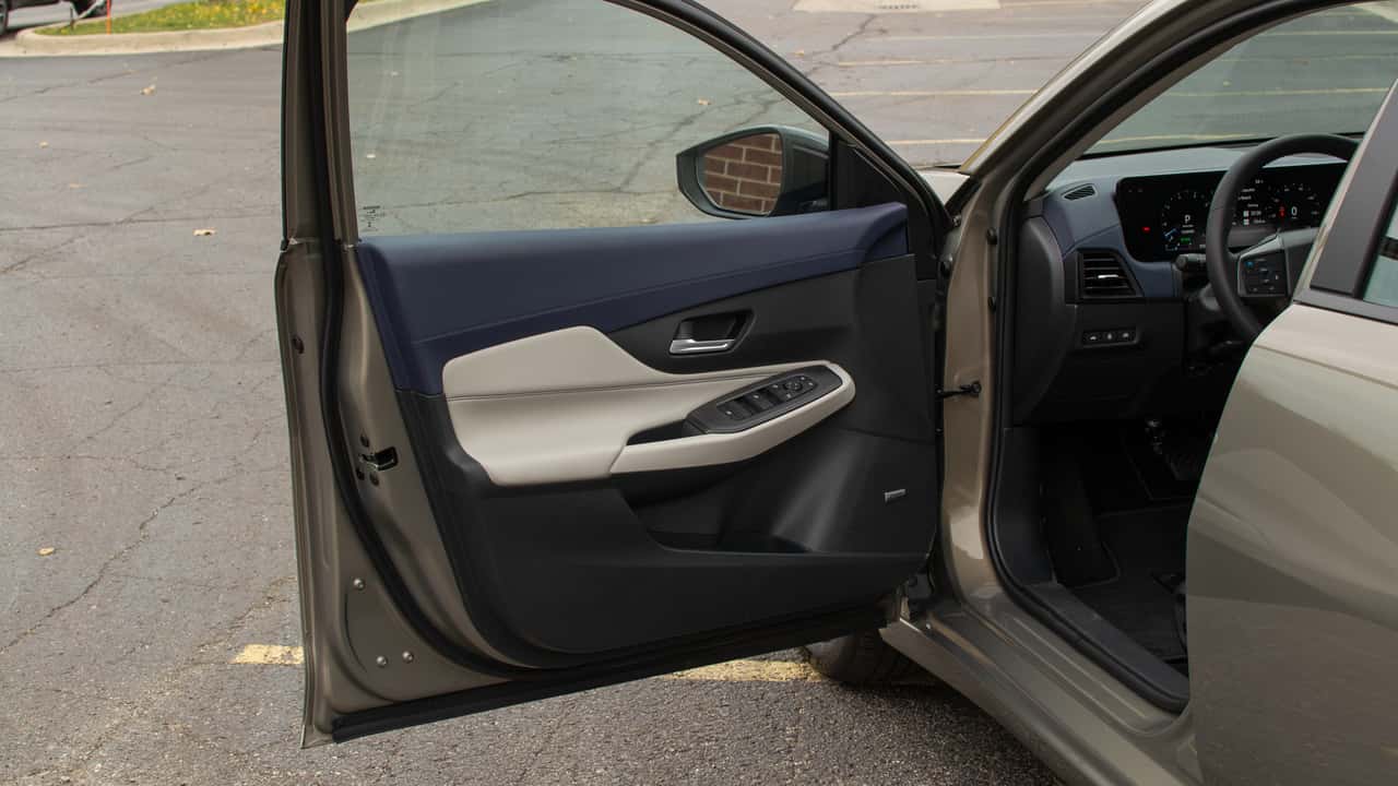There are a handful of physical buttons. The Sentra borrows the volume and hazard stack from the Leaf, which sits between the central vents. There are also controls for the drive modes, auto stop-start, and auto hold functions located behind the shifter and a few buttons on the left side of the steering wheel, such as those for the heated steering wheel.