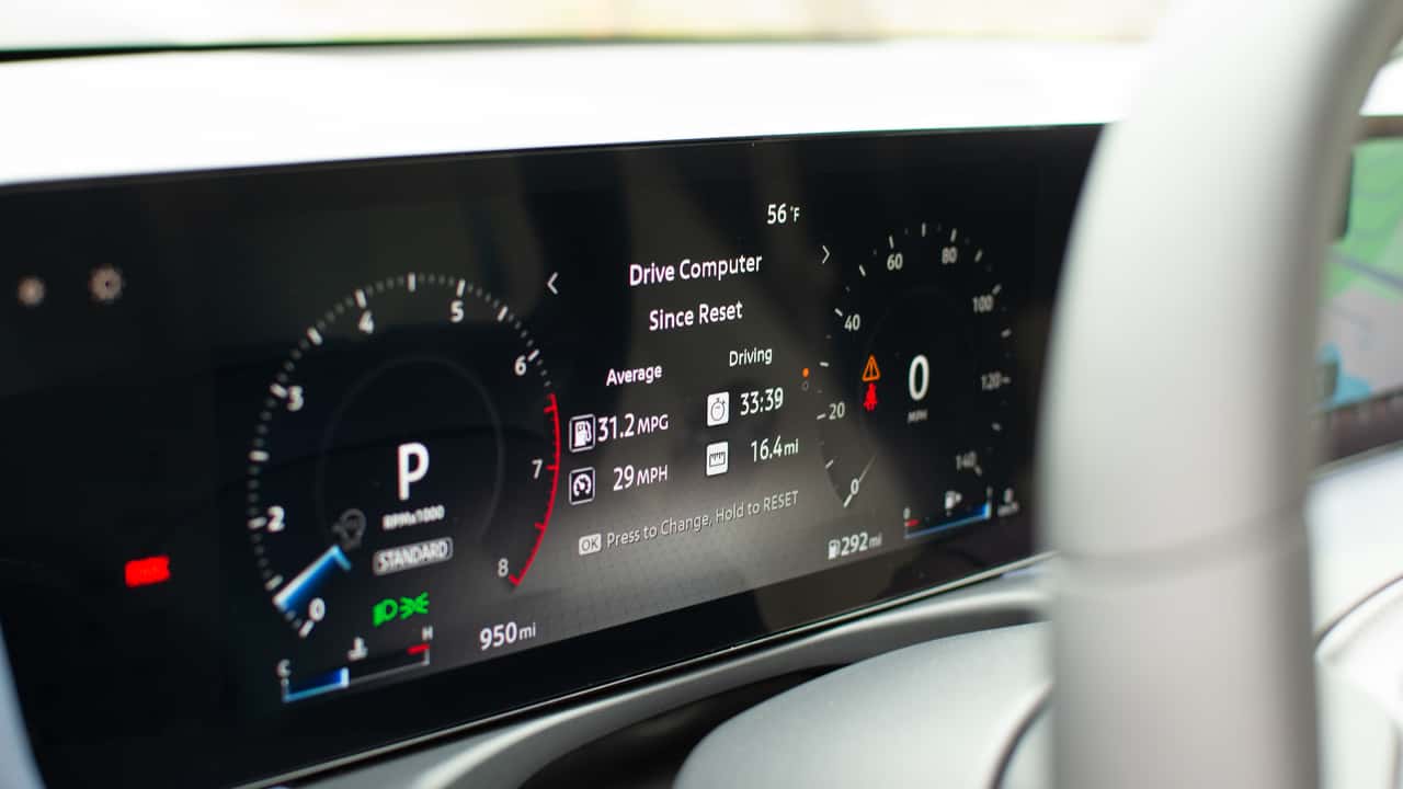 The SL tested here is packed with features, including a heated steering wheel, heated seats, ambient lighting, an auto-dimming rearview mirror, and quilted synthetic leather upholstery. The Sentra comes with dual 12.3-inch displays on every trim except the base model, which Nissan positioned low in the dash to improve forward visibility.